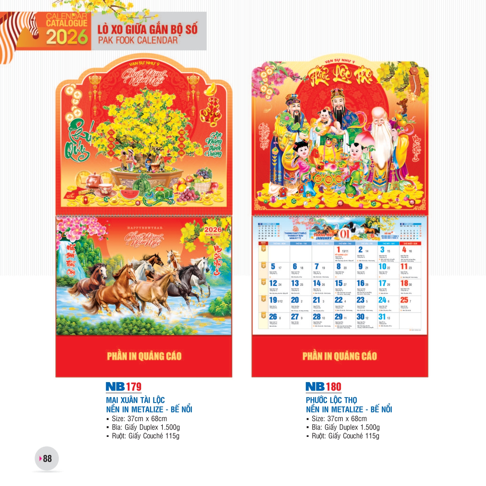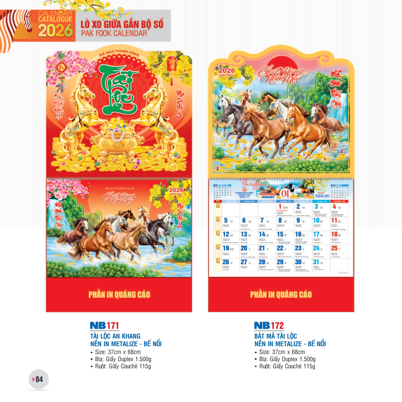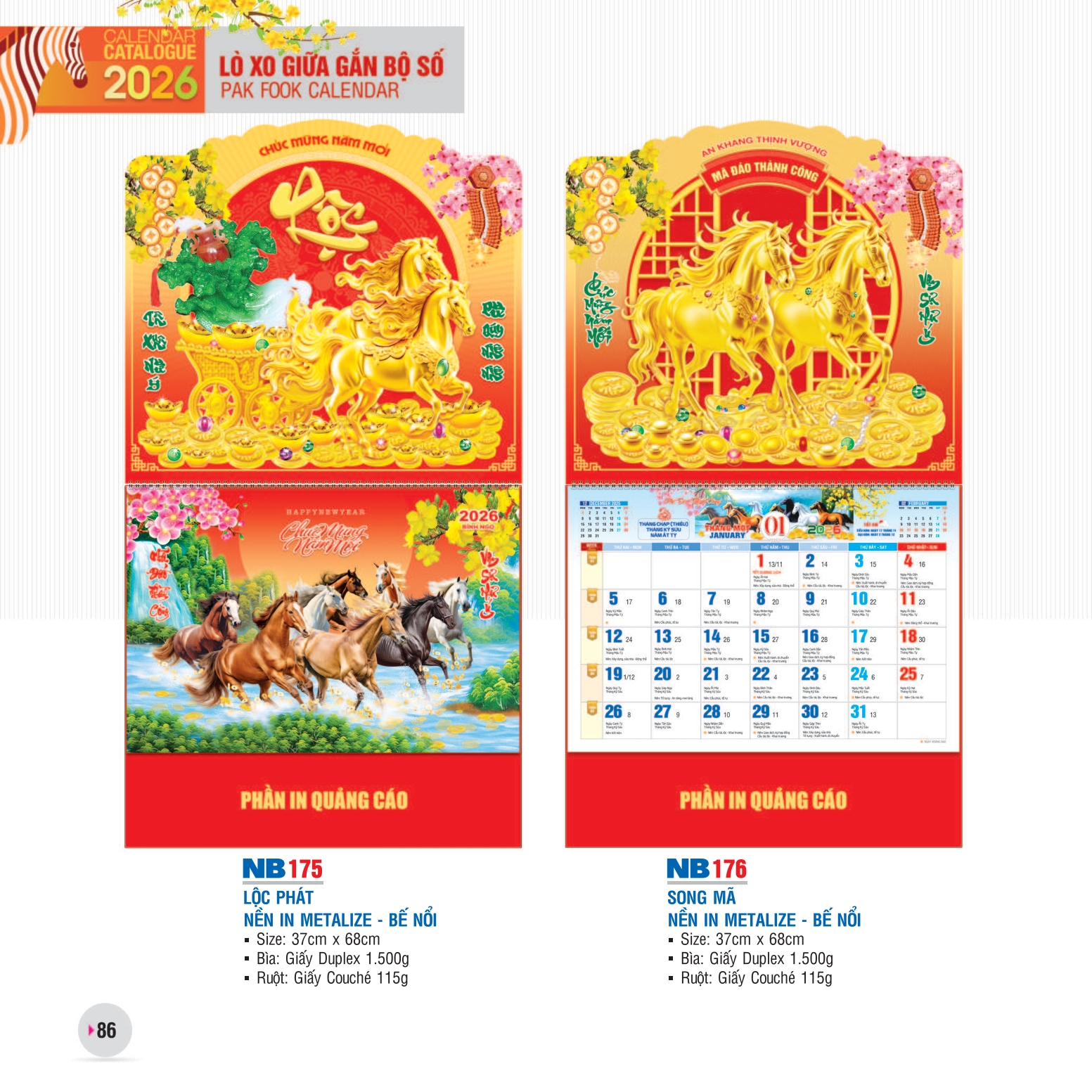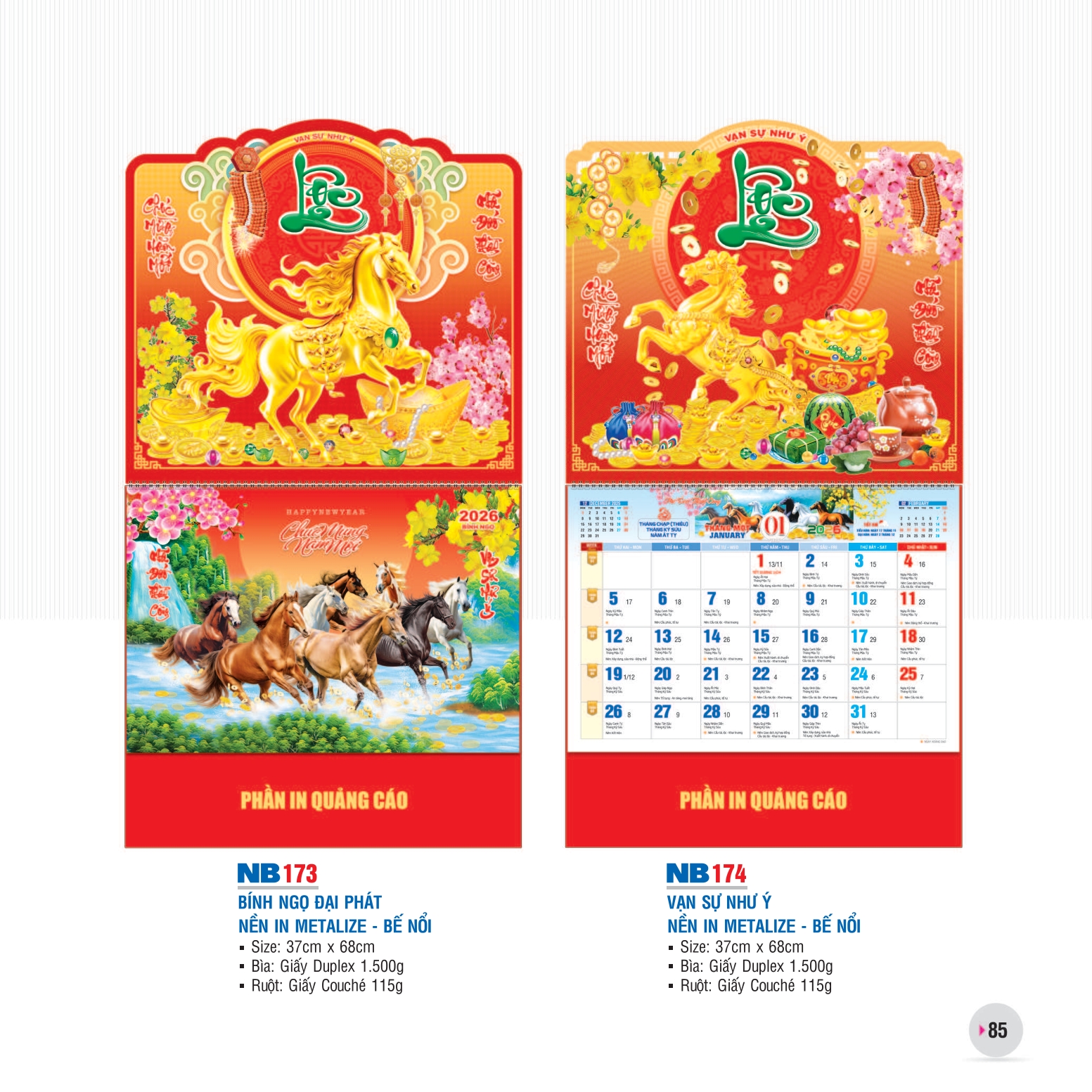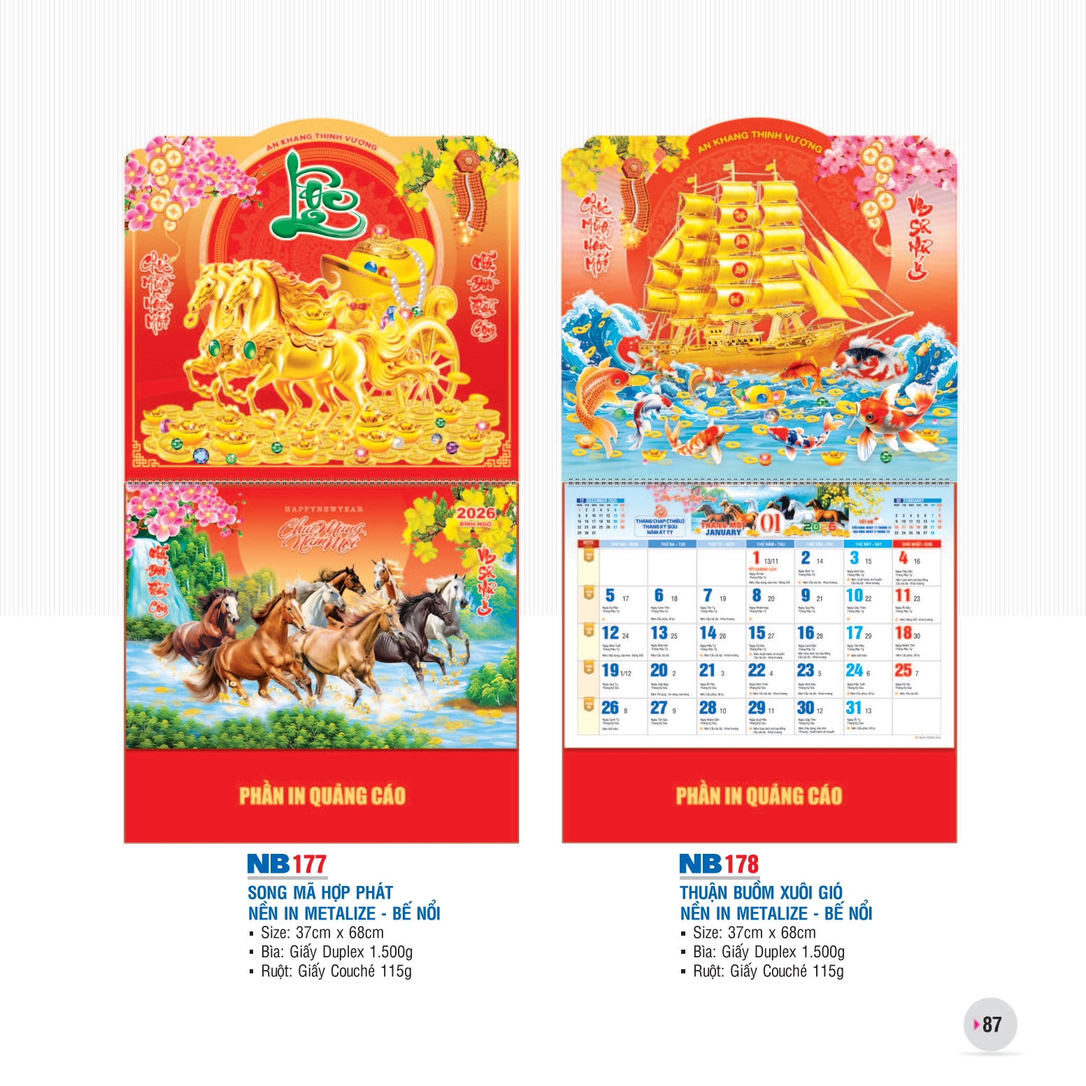 Mẫu lịch nổi bật với hình ảnh đàn ngựa phi nước đại giữa ánh bình minh – biểu tượng cho tốc độ, thành công và phát triển vượt bậc. Bìa in Metalize ép nổi 3D, tông vàng đỏ chủ đạo, chữ thư pháp “Mã đáo thành công” mang ý nghĩa chúc năm mới thuận lợi, vạn sự như ý.Thiết kế mang đậm nét Phong thủy với hình ảnh cá chép hóa rồng – biểu tượng cho tài lộc và thành đạt. Tông cam – vàng rực rỡ kết hợp hiệu ứng ép vân 3D, dòng chữ “Phúc – Thịnh Vượng” uốn lượn tinh tế, thích hợp làm quà tặng Tết cho doanh nghiệp và đối tác.Bìa lịch in hình con thuyền vàng rực tiến ra khơi, biểu tượng cho hanh thông, khởi đầu thuận lợi. Mẫu còn gây ấn tượng với họa tiết 12 con giáp bao quanh chữ “Phúc”, tượng trưng cho sự viên mãn và sung túc quanh năm.