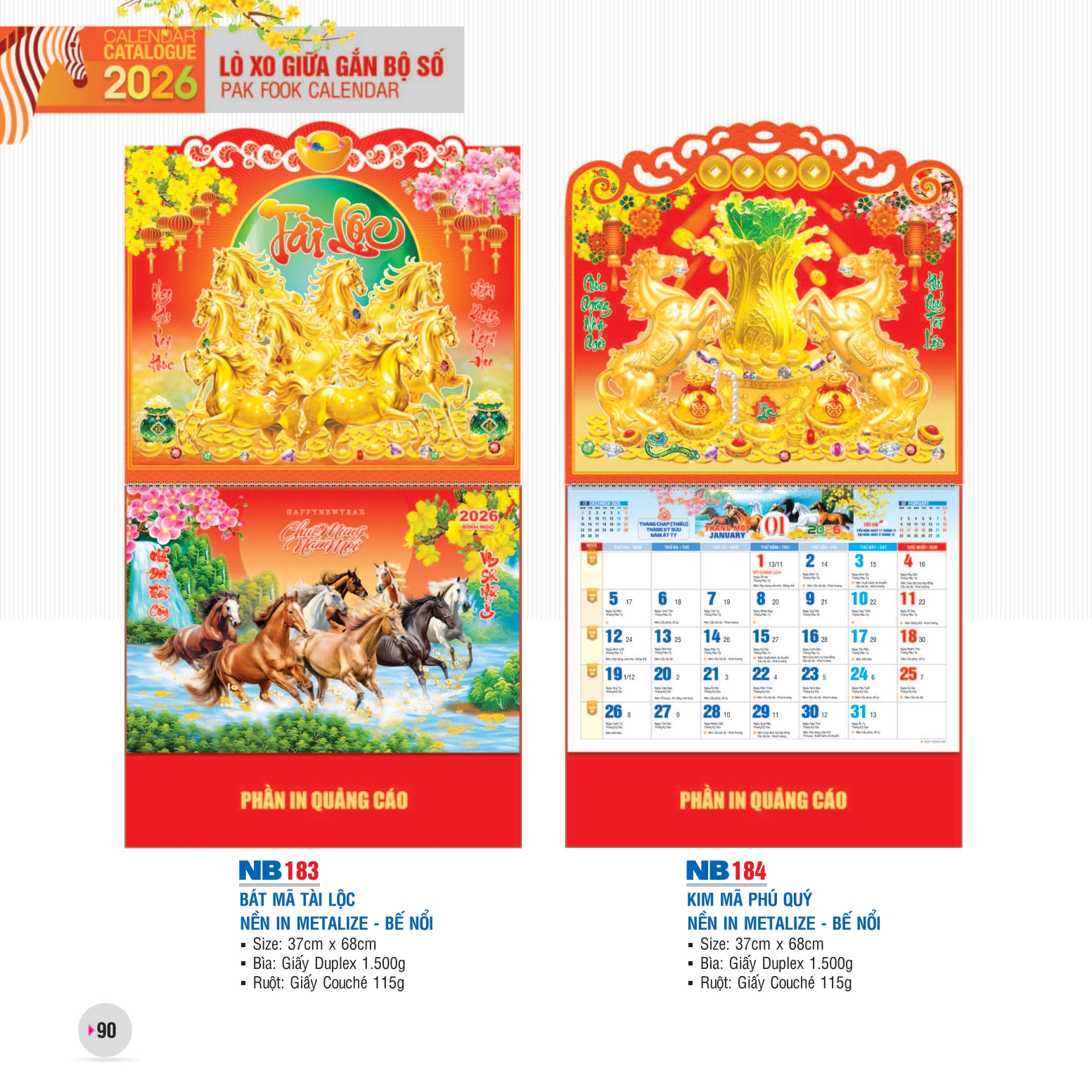 Đôi ngựa vàng chầu bình vàng kim cương tỏa sáng. Mẫu lịch mang thông điệp đại phát – đại cát – vạn sự hanh thông.Hai ngựa vàng song hành, chở kho báu đầy tiền vàng. Biểu tượng phú quý song toàn, may mắn dồi dào.Cây mai vàng nở rộ bên kho báu vàng, chữ “Phát Lộc” xanh nổi bật. Mang thông điệp phát tài, cát tường như ý.Túi vàng lớn tràn đầy thỏi vàng, hoa mai nở rộ hai bên. Mẫu mang ý nghĩa của cải sung túc, phú quý viên mãn.Ngựa vàng kéo xe chứa đầy kho báu, đồng tiền vàng lấp lánh. Thể hiện vận khí tốt lành, tiền tài dồi dào.Hai ngựa vàng song hành chầu chậu vàng, đồng xu rải xung quanh. Biểu trưng tài lộc viên mãn, sung túc quanh năm.